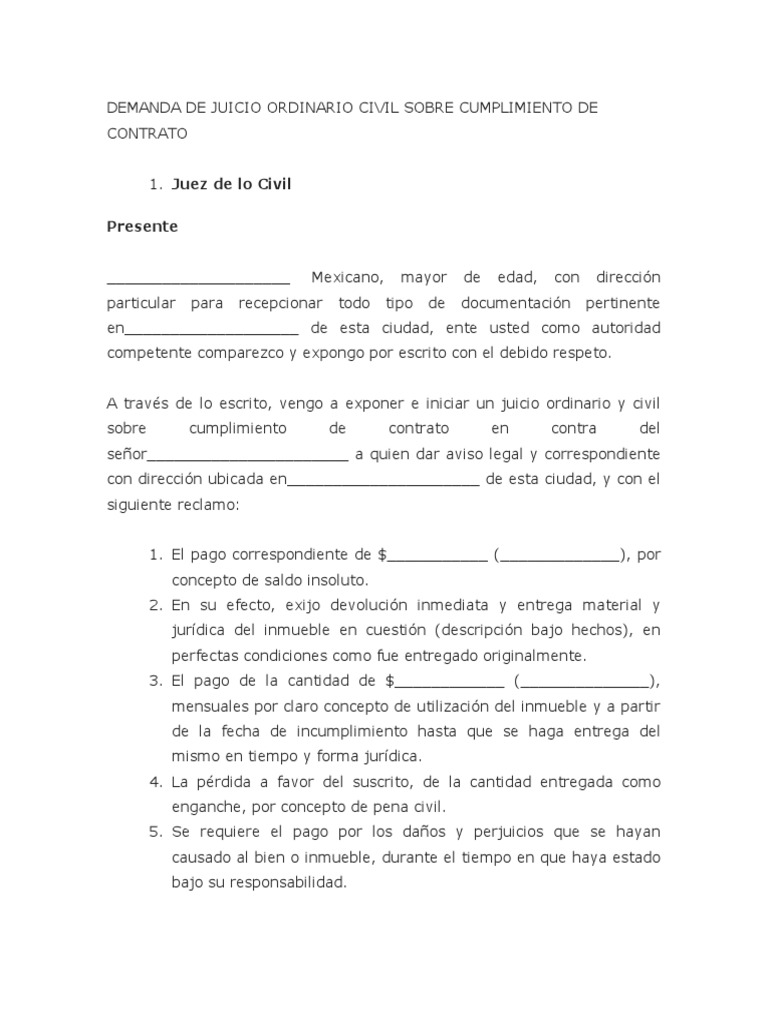 Demanda De Juicio Ordinario Civil Sobre Cumplimiento De Contrato Derechomexicano Com Mx