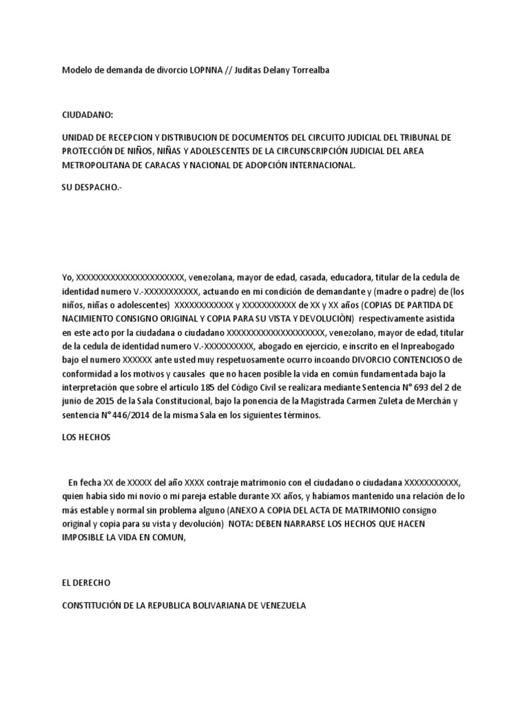 Modelo demanda divorcio contencioso sin hijos. Modelo de demanda de divorcio contencioso sin separacin judicial previa artculos 812 y 86 CC. JUEZ XXXXXX con domicilio real en XXXXX Capital Federal con patrocinio letrado del Dr. Que se establezca la proporcin en que los cnyuges deben contribuir a los gastos de crianza educacin y establecimiento de los hijos Si el cnyuge que demanda no tiene capacidad econmica para hacerlo se puede solicitar que sea.
