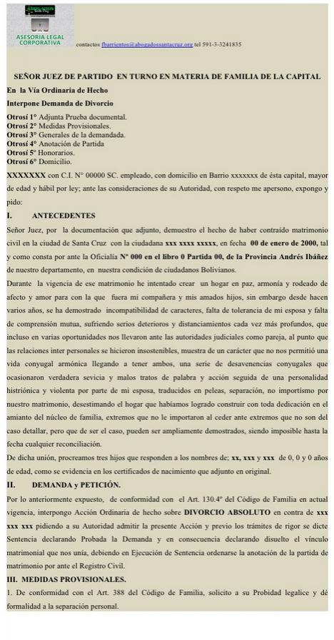 El divorcio sin hijos contencioso es bastante ms caro si bien no hay que desdear la posibilidad de solicitar justicia gratuita a cuyo frente se erige un panel de grandes profesionales. AL JUZGADO DE I INSTANCIA DE Don Don Procurador de los Tribunales en nombre y representacin de Doa segn acredito mediante escritura de poder bastante para pleitos que se acompaa al presente escrito para su insercin en autos por copia con ruego de devolucin del original comparezco ante el. MODELO DE DEMANDA DIVORCIO CONTENCIOSO GUARDIA Y CUSTODIA A FAVOR DEL PADRE LOS DATOS SON FICTICIOS Creado en Domingo 14 Agosto 2016 1600 Valoracin del Usuario.