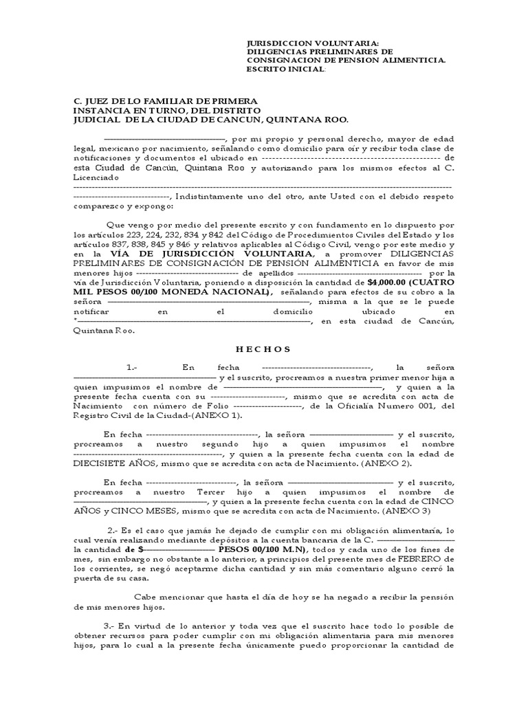 Modelo de escrito solicitando la consignacin judicial de la renta de alquiler. Compra ahora el documento totalmente editable y completo por 20 MXN. A a favor de la seora_____para alimentos de ella y nuestros dos menores hijos de nombres_____ ambos de apellidos_____ quien tiene su domicilio en la casa no_____ de las calles_____ mismo que desde.
