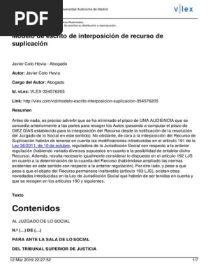 Impugnacin de recurso de suplicacin doc 387 KB 22. 1913a de la Ley 362011 de 10 de octubre Reguladora de la Jurisdiccin Social. Que a travs del presente escrito formalizo Recurso de Suplicacin en tiempo y forma dentro del plazo legalmente establecido contra la sentencia n _____ de _____de _____de _____ en base a los siguientes.