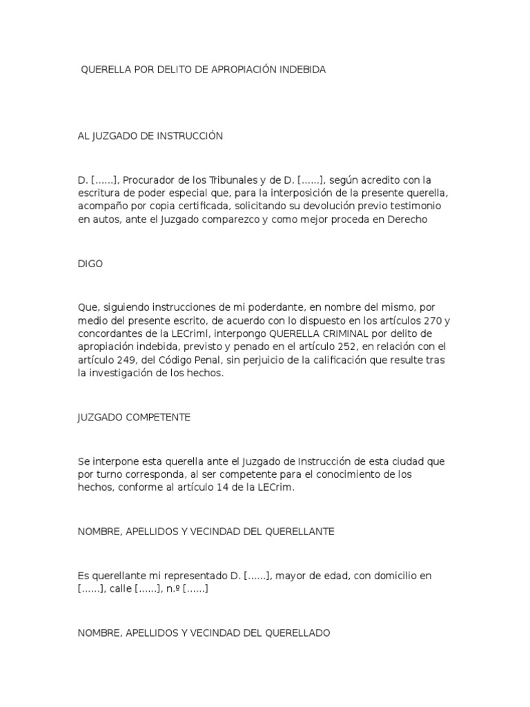 Cdigo Penal solicitando se me tenga por parte querellante. El querellante es D mayor de edad de profesin con domicilio en. Modelo general de querella AL JUZGADO DE INSTRUCCIN Don Procurador de los Tribunales y de CLIENTE segn acredito con la escritura de poder especial para este asunto o con clusula especial ante el Juzgado comparezco y DIGO.