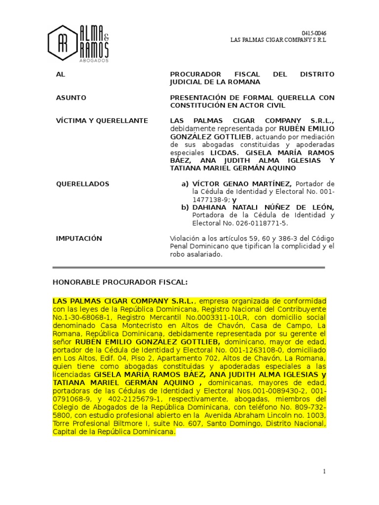 Esta querella se presenta ante el Juzgado de Instruccin de por ser el competente con arreglo a lo dispuesto en el art. II y actualmente recluida en la crcel modelo de Najayo pabelln I culpable de violar las. Estando especialmente facultado para ello en la Escritura Pblica Notarial de poder general y especial para pleitos que se adjunta y siguiendo expresas instrucciones de mi mandante vengo a interponer QUERELLA CRIMINAL contra F.