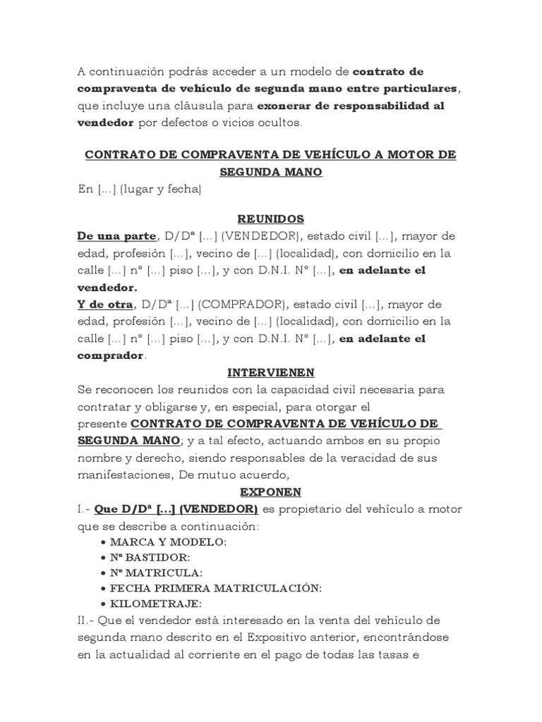 CP localidad y provincia. Ahora bien si la adquisicin de tu vehculo usado fue realizado a un vendedor profesional como concesionario taller etc tendrs como comprador una garanta que te proteger contra este tipo de vicios ocultos siendo aplicada la Ley de Consumidores y Usuarios que da cobertura legal a la parte afectada. Mediante este documento el comprador de un vehculo automvil coche moto furgoneta etc usado podr exigir al vendedor su responsabilidad por los posibles defectos o vicios ocultos que pudieran aparecer en el mismo tras su compra.