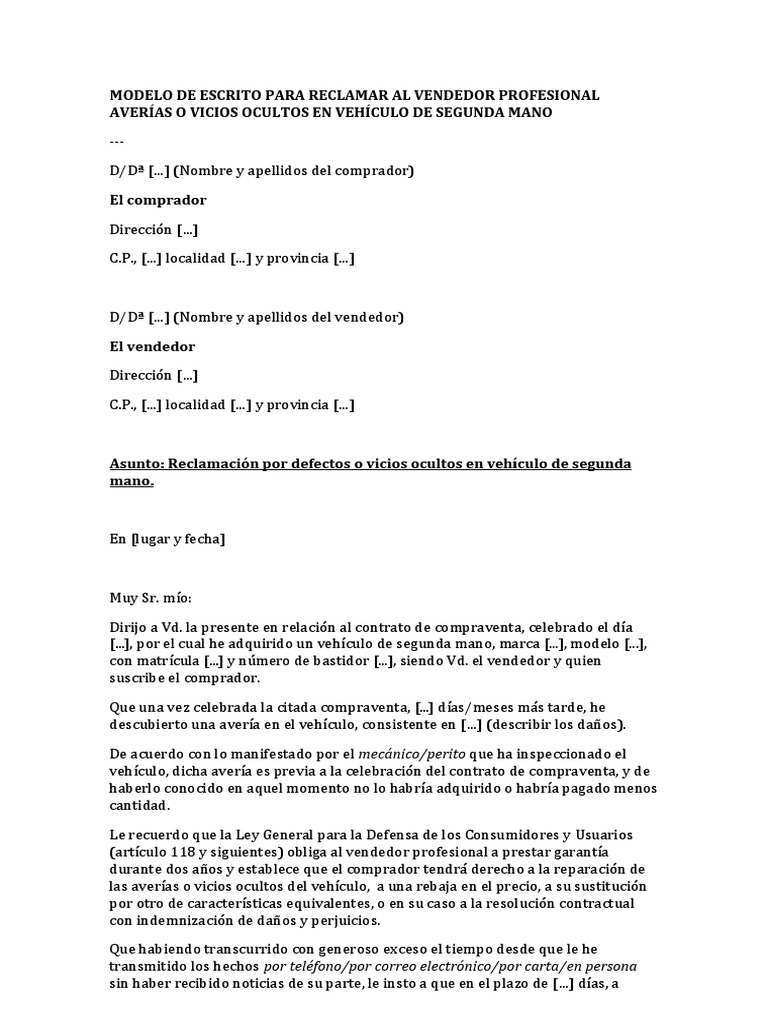 2-Que el comprador por su profesin no hubiera sido capaz de detectarlo cuando se llev a cabo la. Reclamacin por vicios o defectos. Si tienes que reclamar vicios ocultos al vendedor de tu vehculo a continuacin te dejo un enlace para adquirir mi modelo de escrito.